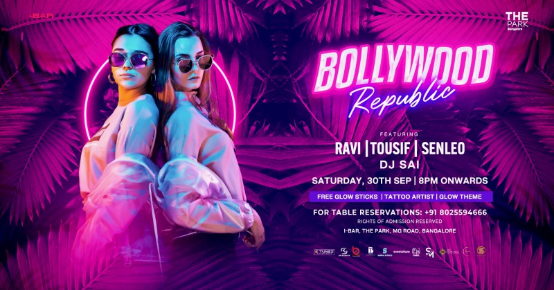 Join us on Saturday for the Bollywood Republic featuring DJ RAVI, DJ Tousif and Dj SENLEO at i-BAR, The Park Hotel Mg Road. Dance to the best of Bollywood, Punjabi & Commercial remixes. A poolside vibe only at i-Bar, The Park Hotel. Register to be on the guest list.