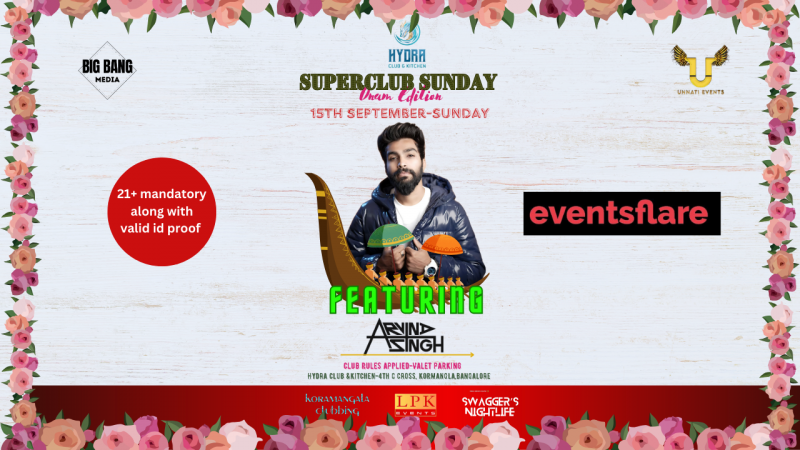 "Celebrate this Onam in style at Hydra Superclub's *Sunday Superclub Night*! Groove to the beats of DJ Arvind Singh and enjoy an unforgettable night of music, fun, and festive vibes. Free shooters for ladies from 9-11 PM, girls enjoy free entry and drinks all night! Couples, don’t miss your free entry via guestlist till 9:30 PM. For stags, we’ve got you covered with fully redeemable cover charges. Let’s make this Onam one to remember!"